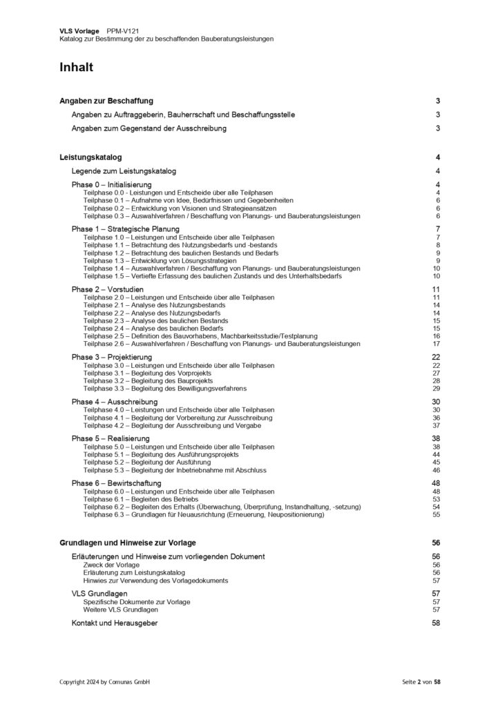 Der Katalog PPM-V121 unterstützt Auftraggeberinnen, Bauherrschaften und Beschaffungsstellen dabei, die erforderlichen Bauberatungsleistungen in jeder Projektphase systematisch zu erfassen und zu definieren. Die Vorlage basiert auf dem VLS-Standard PPM-S121 «Leistungen und Zuständigkeiten der Bauherrschaft und der Bauberatung» und ist ein integraler Bestandteil der VLS-Pflichtenheftvorlagen BE-V123 und BE-V124.